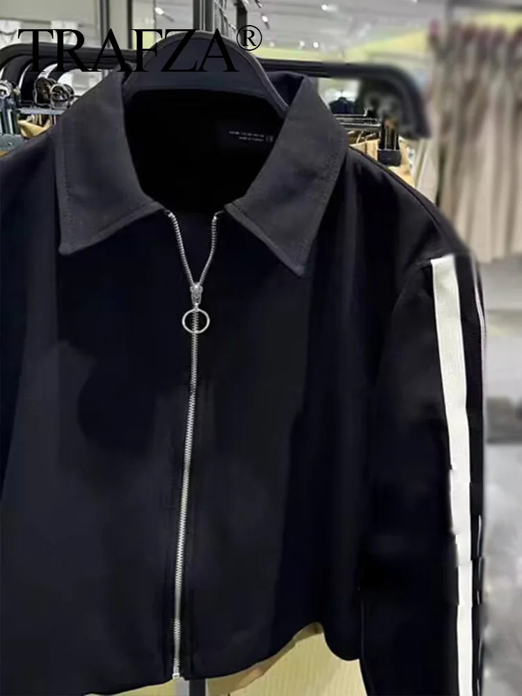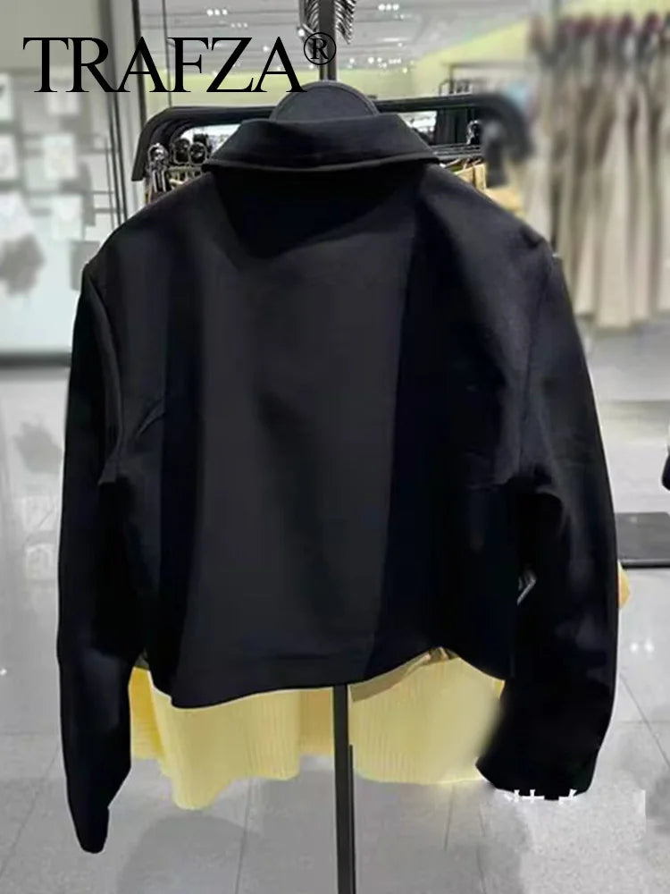 TRAFZA 2024 New Women Casual Black Trousers Suits Sports Short Jacket + Female Vinatge Black White Patchwork Baggy Pants Street